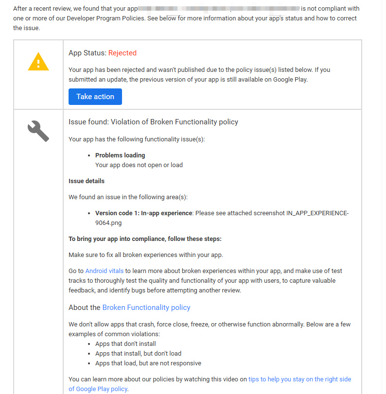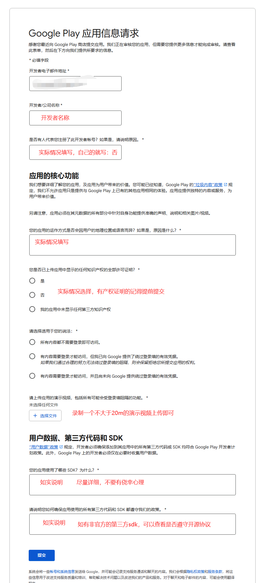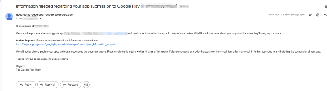9. 又过了一周,收到了Google要求填写“应用内容”的邮件。这是谷歌审核期间很常规的问询表单,不用过于担心,如实填写即可!