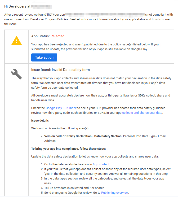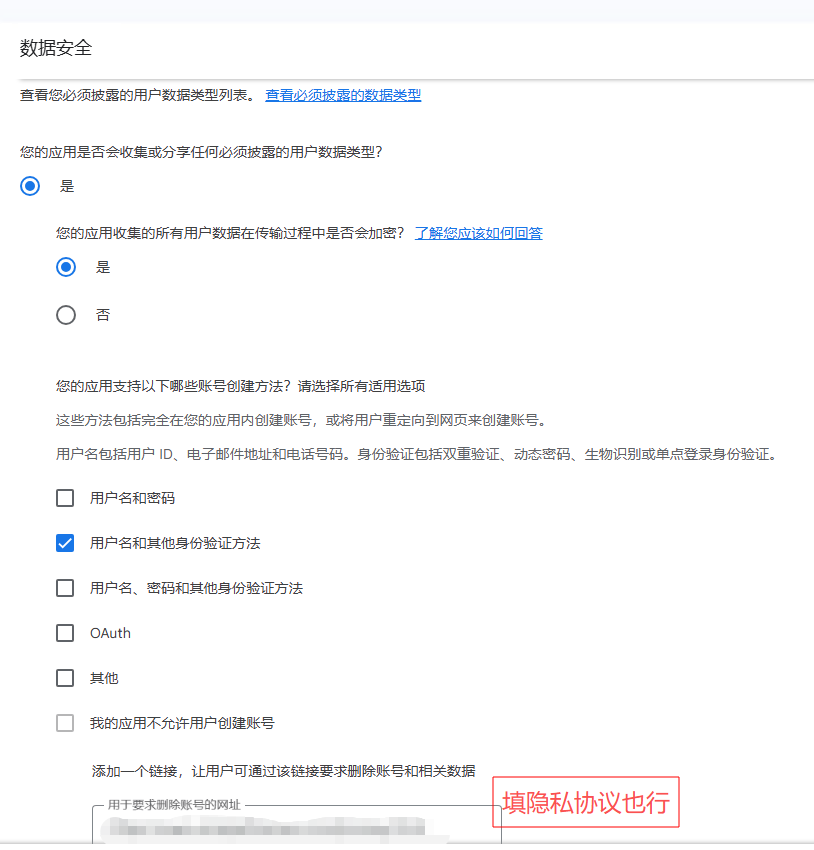 2. 大概意思就是数据安全选项出问题了,不符合政策要求。因为这个应用是有用到Google邮箱登录的,而数据安全声明里没有勾选到对应的选项。