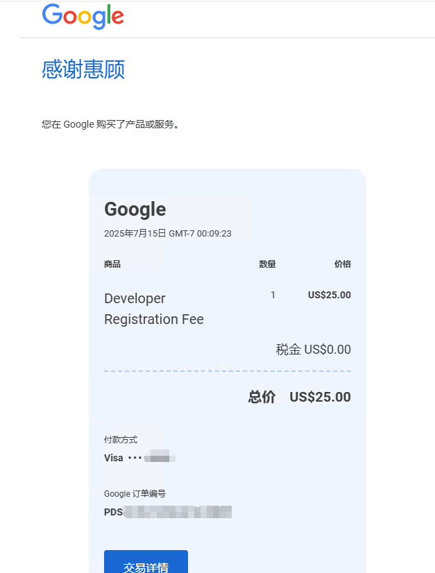 这个开发者账号注册时间为2025年7月,相关支付凭证截图: